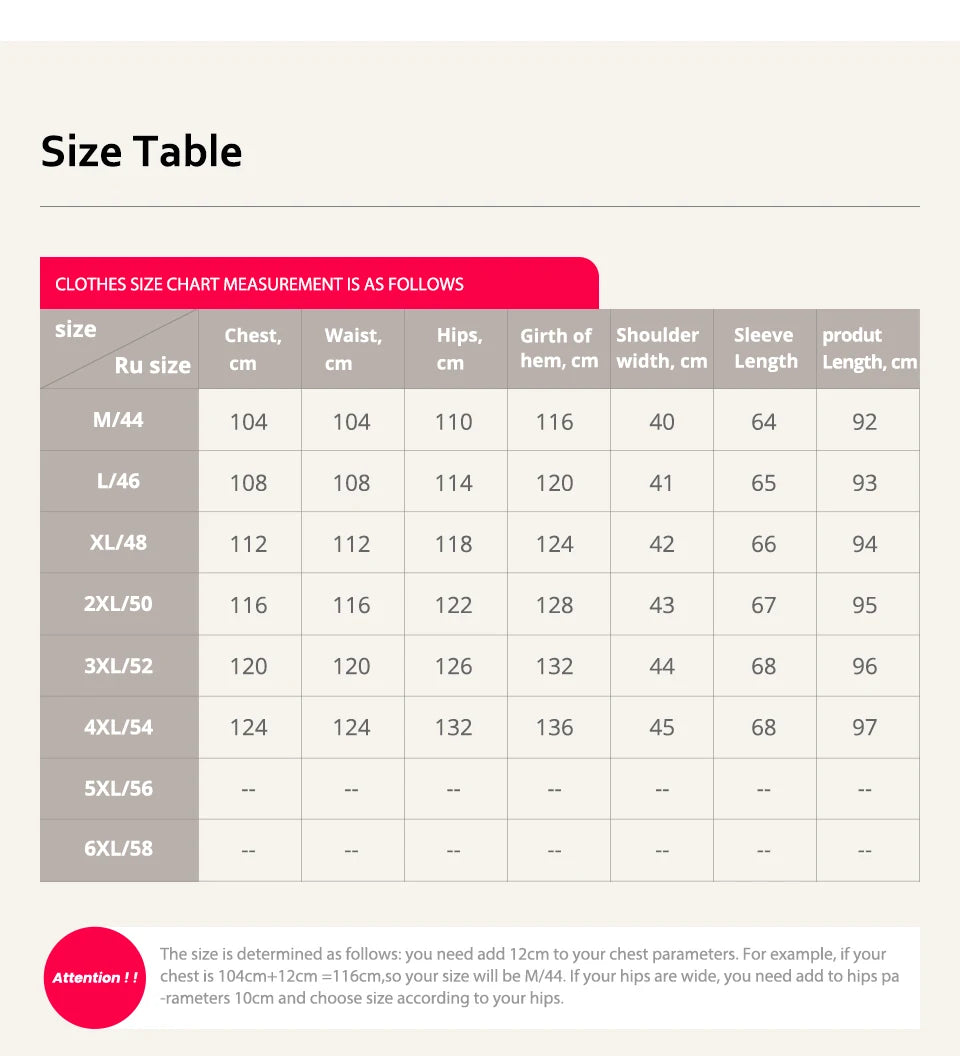 | Taille | Tour de poitrine | Tour de taille | Tour de hanches | Circonférence du bas | Largeur d’épaules | Longueur de manche | Longueur du vêtement