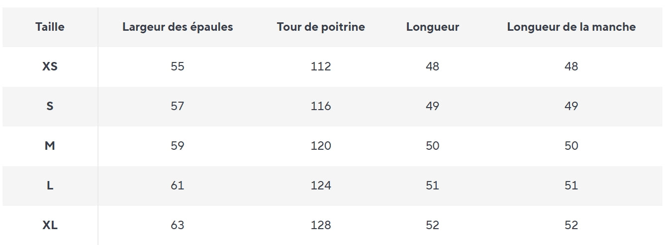 | Taille | Largeur des épaules | Tour de poitrine | Longueur | Longueur de la manche |
